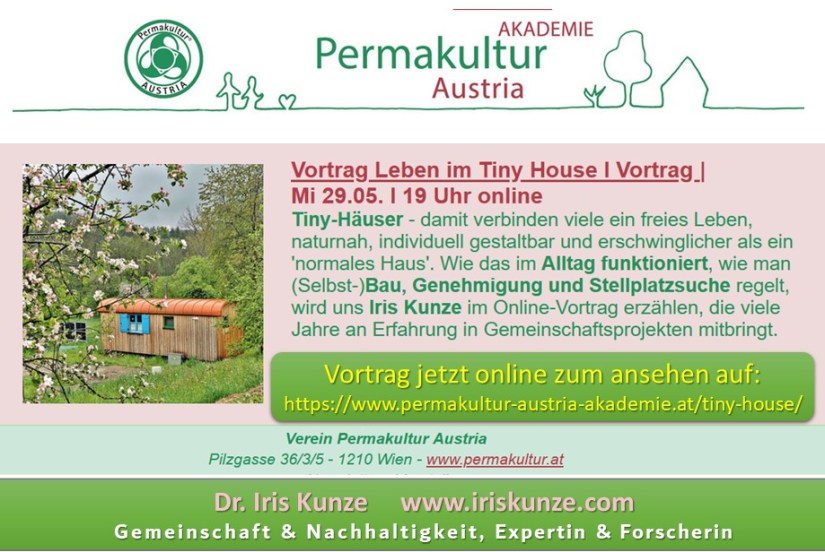 Technische Details im bildertem Vortrag über mein Tiny Haus Leben bei der Permakultur Austria Akademie vom 29. Mai 2024 ist online auf der Webseite der Permakultur Austria Akademie: https://www.permakultur-austria-akademie.at/tiny-house/